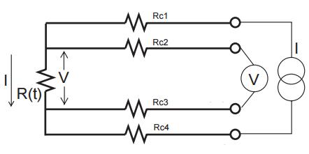 Este metodo es el mas preciso ya que incluso los cables pueden tener diferente resistencia, en este metodo se hace circular una corriente conocida en los cables de los extremos (cables 1 y 4) , entre los cables 2 y 3 se conecta un voltimetro en estos cables la caida de potencial es igual a cero, asi que el voltimetro medira el mismo voltaje que R(t), la resistencia se obtiene al dividir el voltaje medido y la corriente conocida.